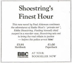 ratings up. Recently, Eddie Shoestring hadn't solved anything much more challenging than: Who Ran Over the Cat? And his ratings were sagging badly. Don, the station boss with no love for losers, was beginning to hint that a Radio Auction might have more pull than a Radio Detective. It was Shoestring's lowest hour. Or was it? A week later, he was chief suspect in a murder case and felt that he'd really struck bottom. But it could also be his big chance. Eddie issued a public challenge to the police on his programme. He'd not only clear his name but bring in the murderer before the law found him.
